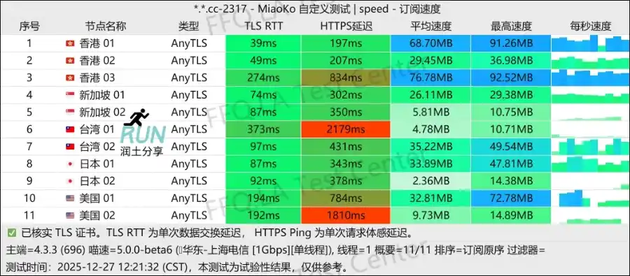 换 AnyTLS 协议之后的首次测速,节点可用性应该有所下降,不过也能满足大部分使用场景。